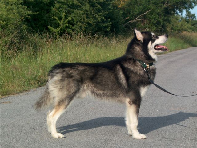 He has only been shown very occasionally preferring to get hard to work on the trail. A fantastic working dog he just loves to be in harness, whether he's working on his own or as part of a team. He's also a keen backpacker along with the rest of the family.....he is a real action man!